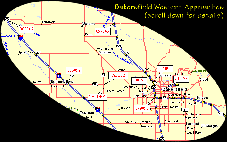 This file describes getting to Bakersfield from the west, either from Hwy 99 or Interstate 5.