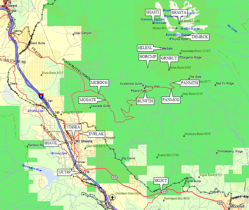 Two miles north of Hwy 89, leave I-5 at Lake Street, the central exit for the village of Mount Shasta (waypoint SHAVIL). Lake Street crosses some railroad tracks and continues northeast to the Everitt Memorial Highway (waypoint EVRLAK). The Fifth Season climbing store (waypoint 5THSEA, on the corner of N Mt Shasta and Lake two blocks NE of the tracks) can supply any last-minute climbing needs (including free mandatory human waste disposal bags), and will sell you a summit pass ($20 each in 2012).