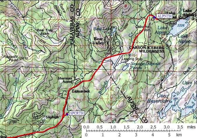 The Lake Alpine Sno-Park (waypoint ALPNTH) has a large snow-mobile concession, and is located where Hwy 4 is gated in winter. There is no trailhead sign and no sign of the lake from the trailhead!