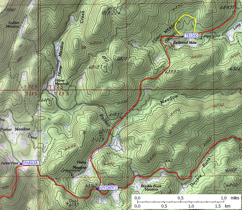 Waypoint LEWCMP looks like a new trailhead and appears to be a shortcut from the old trailhead. The map shows the trail going north from the end of this road, but going east-northeast there is another sign and another (better) trail. The trail DROPS 700 feet to Jerkey Meadow. The round trip gain is roughly the same as starting at Lloyd Meadow, but you stay higher and have some climbing to do on the way out instead of on the way in.