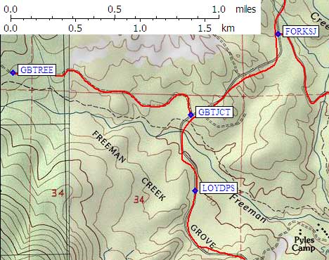 Ignore all the dirt side roads, stay on the pavement. At waypoint GBTJCT there is a signed junction with a dirt road that goes west (left) to the George Bush Tree (part of the Freeman Creek Grove, it seems). It's a short drive to the parking lot (waypoint GBTREE) and an even shorter walk to the tree with a plaque commemorating an act taken by the first President Bush to preserve giant sequoias. The signs aren't perfectly clear, but you head downhill from the parking lot, going south and then west if memory serves me correctly.