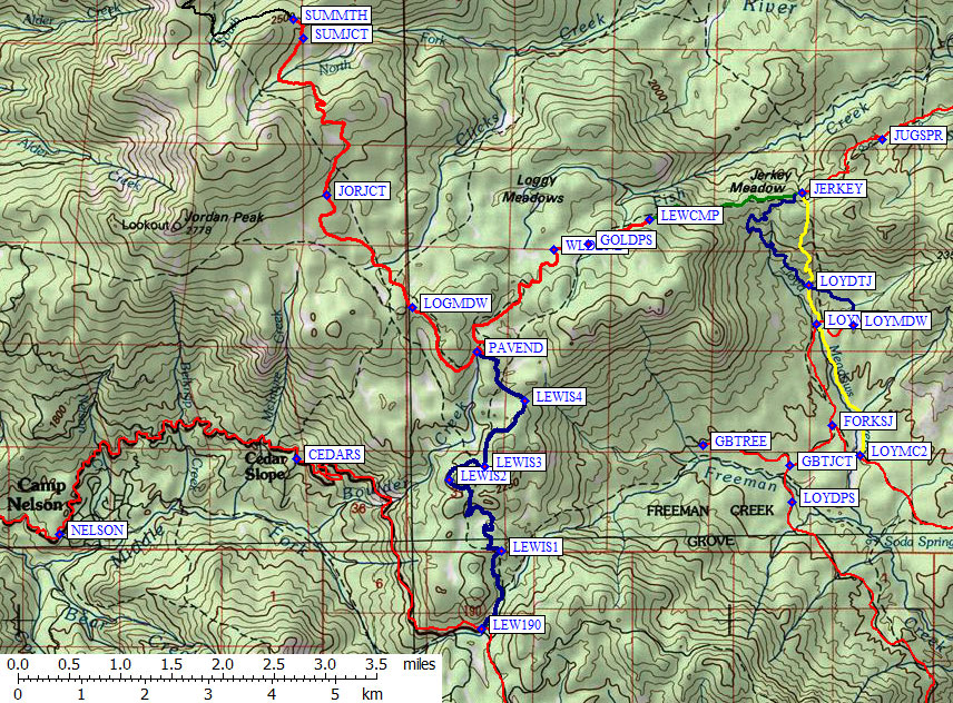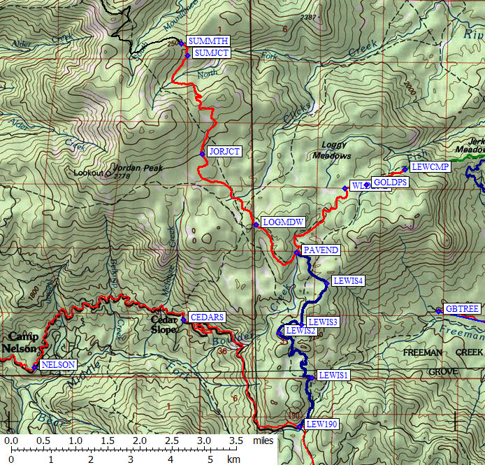 Lewis Camp trailhead, to the Jerkey Meadow trail junction (GPS route LEWIS CAMP)