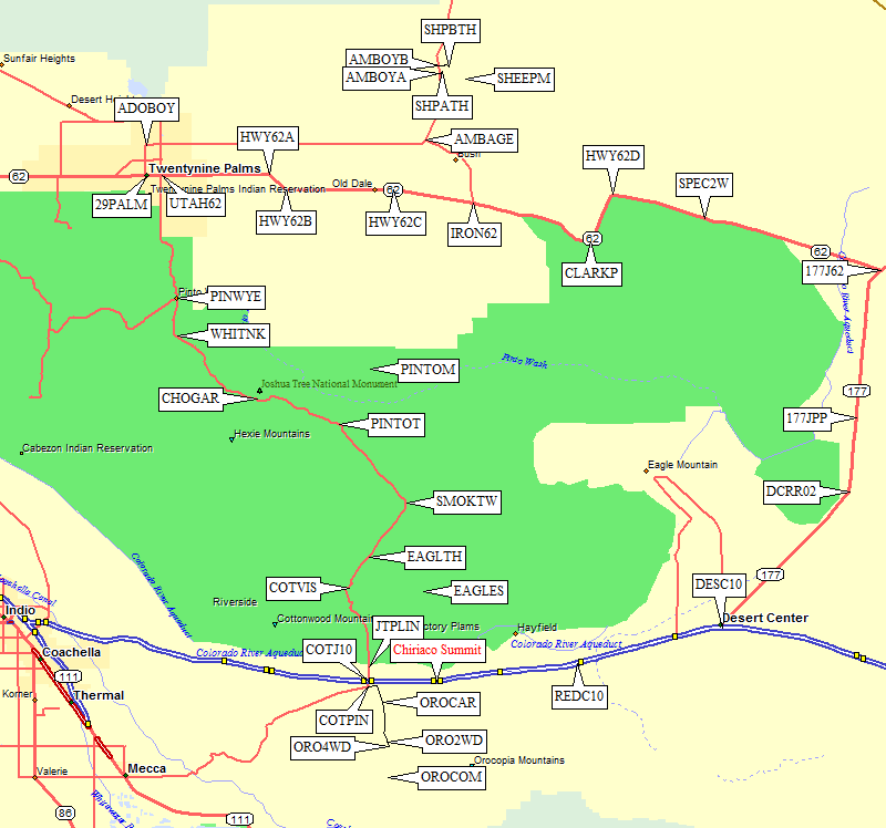 Halfway between Indio and Desert Center on I-10 (23 miles from each of them), exit at Cottonwood Springs Rd, the turnoff for Joshua Tree National Monument (waypoint COTJ10). This is the first exit west of Chiriaco Summit. For Orocopia, go south toward Mecca. For Eagle and Pinto, go north into Joshua Tree. (Continuing north will take you to Hwy 62 near Twentynine Palms, 45 miles from I-10.)