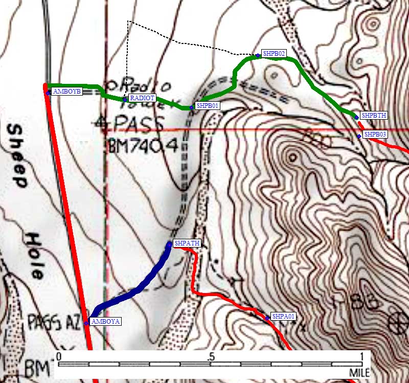 where it turns north at Iron Age Road (waypoint AMBAGE) and climbs 5 miles to Sheep Hole Pass.