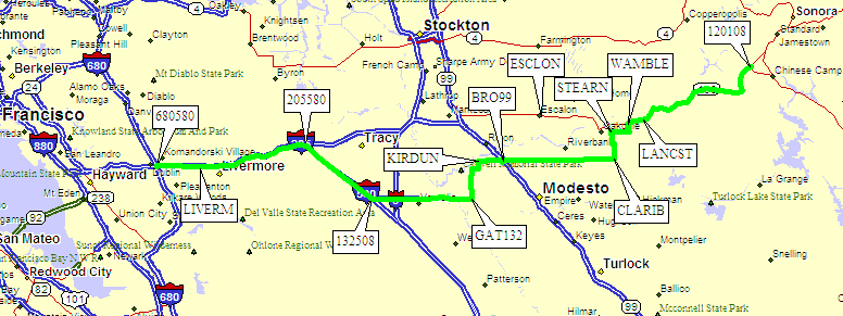 There are three GPS routes in this file: The first route (OAKDALE NORMAL) represents the best choice for light traffic days. It is 19 miles shorter than the MACRO BYPASS route but may be faster when Tracy, Escalon, and Oakdale have stop-and-go traffic. The second rout (OAKDALE BYPASS) just gets you around the town of Oakdale, using Rodden Road to the north. The third route (MACRO BYPASS) winds around farm roads to avoid most towns, skirting south of Oakland and Tracy, and skirting north of Modesto.