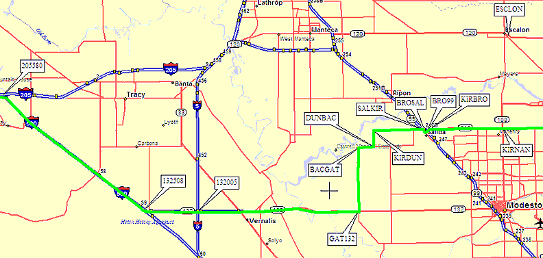 Take I-580 east from Livermore, and stay on it toward I-5 at waypoint 205580, avoiding Tracy. Before reaching I-5, turn west on Hwy 132 (waypoint 132508), and head for Modesto.