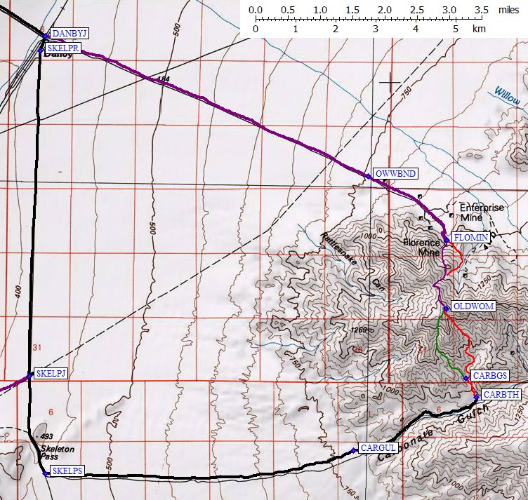 The DPS Guide has a route to the north side of Old Woman, but the road has been closed at a new wilderness boundary which makes that approach a longer walk than the Guide indicates. I haven't done that side of the mountain, and would appreciate details from anyone who has. The driving route should go from DANBYJ southeast to the Old Woman Wilderness boundary (waypoint OWWBND), after which you walk up the road to the Florence Mine (waypoint FLOMIN).