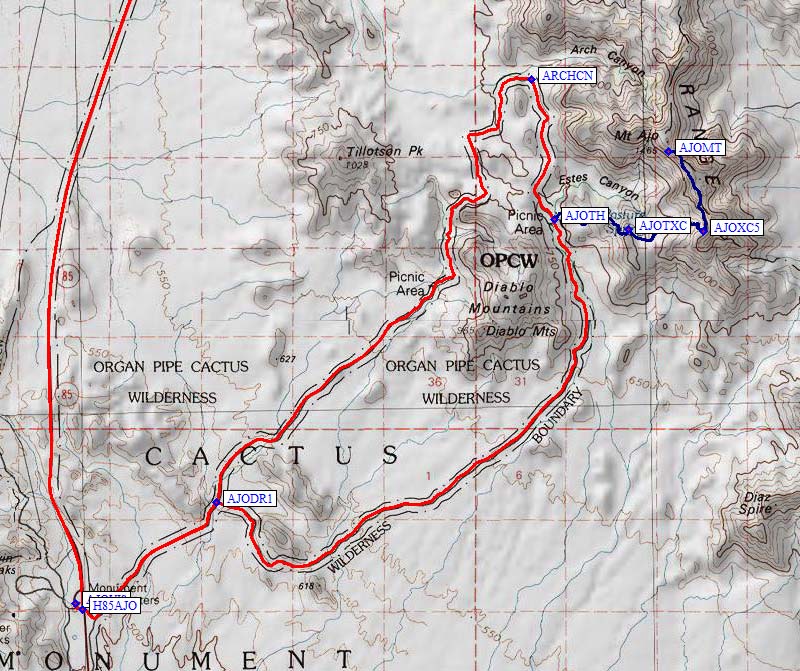 33 miles south of the central plaza in the town of Ajo (waypoint AJOPLZ), 23 miles south of the highway junction near the town of Why (waypoint WHYJCT), is the turnoff for the Organ Pipe Cactus National Monument visitor center turnoff (waypoint H85AJO). The visitor center is a tenth of a mile west of Hwy 85, while the road to Mt Ajo goes east. If you don't have a National Parks Pass, you'll need to pay at the Visitor Center before entering the monument.