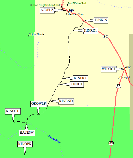 Less than 3 miles south of the central plaza in the town of Ajo (waypoint AJOPLZ), almost 9 miles north of the highway junction near the town of Why (waypoint WHYJCT), is the turnoff for Kino. It's the only intersection near the HUGE pile of tailings from the local copper mine, once the largest open pit mine in the world. (The guy at La Siesta Hotel told us they didn't have to fill it back in as long as it was 'operating', but just about everyone got fired decades ago.) Bates Well road heads southwest from Hwy 85 (at waypoint H85KIN). It's a wide gravel road, and is fine for 2WD passenger cars all the way to the trailhead.