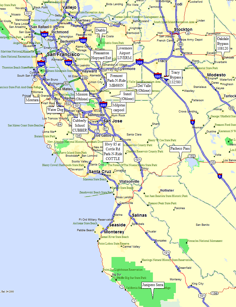 Junipero Serra Cottle Rd at Hwy 85 Hwy 152 Pacheco Pass Cubberly School Carpool Water Dog Lake in Belmont Montara Mountain Area Sunol Mission Peak Ohlone Wilderness Mission Peak and Ohlone Wilderness Pleasonton carpool Oakdale and Tracy Bypass Oakdale Bypass Hwy 680 jct Mission Blvd carpool Livermore Airport parking Milpitas carpool