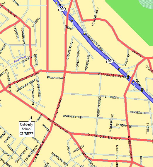 Get on San Antonio Road. From US-101, there is a San Antonio exit. El Camino Real and Central Expressway also intersect with San Antonio. Take San Antonio to Middlefield Road, and turn towards Palo Alto. US-101 drivers turn right onto Middlefield, but El Camino and Central drivers turn left. Cubberley Community Center is a large complex about 1/4 mile north of the San Antonio/Middlefield intersection, on your left. The driveway is opposite Montrose Street, try to park where you won't be in the way (waypoint CUBBER).