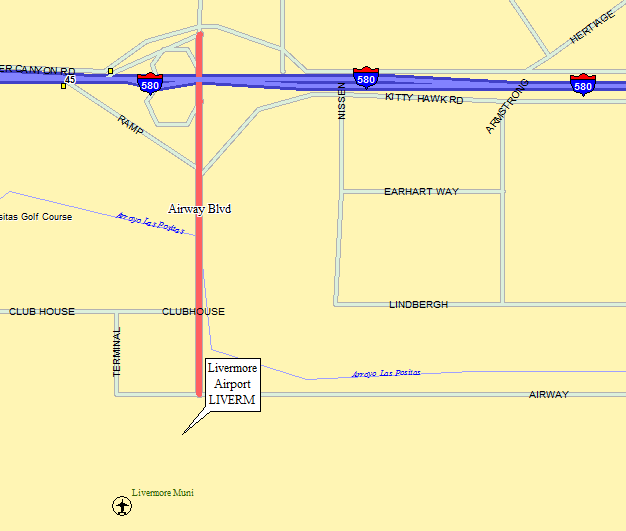 Take 580 east about 6 miles from the 680 intersection, then go south on Airway Blvd in Livermore. As the road bends left there is an air traffic control tower and a parking lot on your right (waypoint LIVERM). The road between the tower and the lot is Terminal Circle: it's the one right AFTER (south of) Clubhouse. The map shows Airway (Blvd) turning east at Terminal (Circle), which is almost what happens. Newer construction made the corner less sharp, but it's still there.