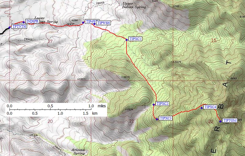 The road ends at a locked gate just below Indian Springs (waypoint TPTNTH). There is only room for 3-4 vehicles here. Walk up the road until it crosses the drainage at Indian Springs, jog right across wash, then find traces of road on the rib a quarter mile east of the crossing.