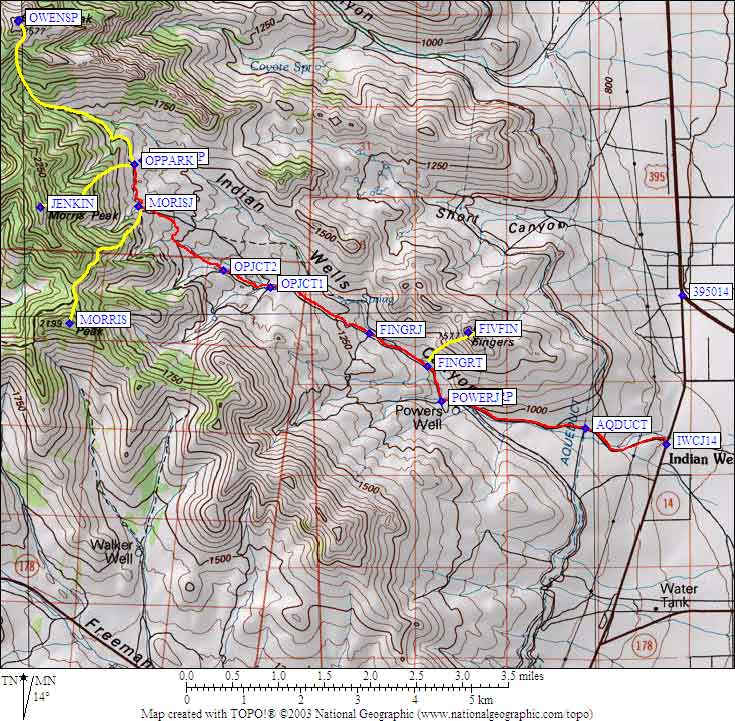 Go up SE164 to a junction near Morris Canyon (waypoint MORISJ) where you are suddenly seeing real trees. Park here for Morris Peak, walking straight up the ridge to the PCT and taking the trail south to Morris. For Owens Peak, turn right and continue half a mile north to the boundary of the Wilderness (waypoint OPPARK at 5400', 7.5 miles from the pavement) where you can park and camp. At the trailhead there is a right fork to a great camping area, waypoint OPCAMP, and you should also see another SE164 fiberglass sign near here.