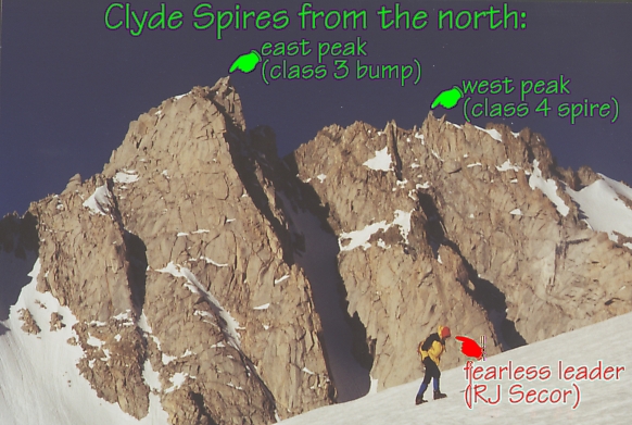 Some explanation of Clyde Spires is required, and the waypoints below may help. Following the ridge from Wallace toward Echo Col, you hit a bump called Crumbly Spire (waypoint CRUMBL) which is 13240' and not interesting... even though it is higher than either of the points we climbed. Next you come to the west spire (waypoint CLYDEW) which is sometimes mistakenly referred to as the north peak. CSWest is really a spire, but receives only passing mention in the West Ridge route of Secor's second edition where it is described as a chimney climb. Next comes the notch we climbed to and then the east "spire" (waypoint CLYDEE) which isn't a spire at all (the summit mass is wider than it is tall). Secor's second edition says CSEast is lower, and a difficult slab climb. The two peaks (CLYDEW and CLYDEE) are just under a tenth of a mile apart, and are both at 13200' as far as I can tell from the 7.5' topo (shorter than CRUMBL).