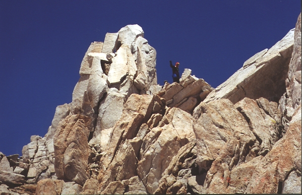 Standing there between the candidates, we decided the west spire was by far the most like a spire and since we couldn't tell which was taller we headed west! It's 3rd class to the base of the spire, and we stayed on the south side or on the crest until we ducked north under a huge chockstone on the ridge. On the north side for about 10', we crossed back to the south and were stymied for a bit before finding a way around the south. About 20' of 4th class led us to the chimney that makes up the spire. This chimney can be protected by throwing a rope over the south rock and wriggling up onto its flat top: A bit of a stretch and you can reach the register on the north rock! A short rope and a couple of slings are adequate for these two bits of 4th class (on CLYDEW). The register is in a crummy PVC pipe placed by the UC's "Sierra Register Committee" in 1988, and its moldy pages claim this spire as the high point. No one has been there in 5 years.