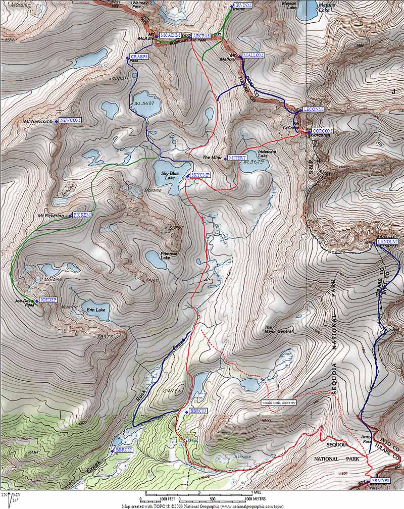I had never been over New Army Pass in summer, and the only time I had visited Sky Blue Lake was early July when the area was mostly snow-covered, so this trip was a chance to climb familiar peaks from unfamiliar surroundings. We started at Horseshoe Meadows and did the trudge over New Army Pass with little fanfare. Nice trail, nippy clear fall air, but a surprising number of people on the trail for a Thursday. (Oh, and by the way, the topo maps do NOT show the trail where it really is - see the trailhead page for details.)