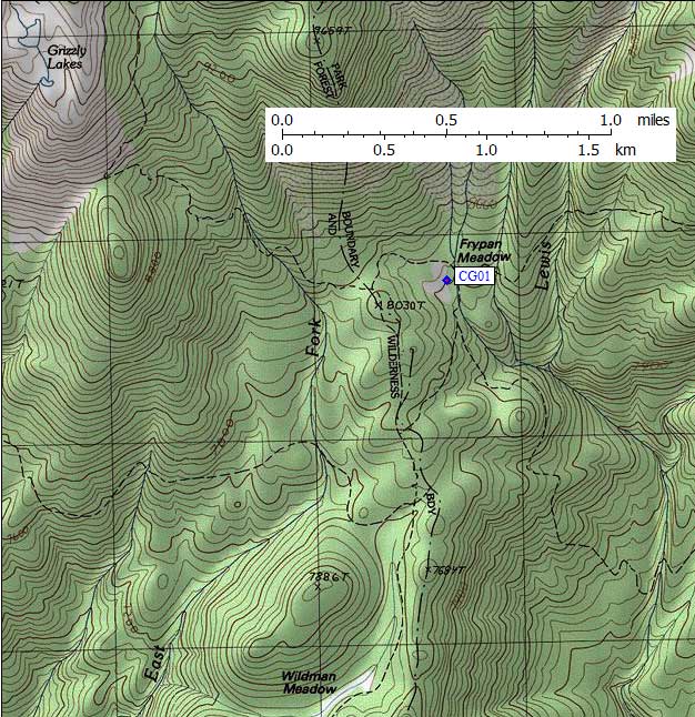 One box in a very small meadow south of ONE OF THE POSSIBLE Grizzley Lakes trail junctions.