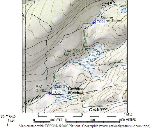a mile north of Lower Crabtree Meadow where Whitney Creek and Crabtree Creek join.