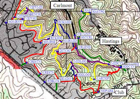 This is a fire-road-width trail from the end of short side-road Ridgewood Ct (waypoint HASTNW) or a tiny playground (waypoint HASTPG) down to Carlmont Trailhead (waypoint CRLEND, just up-canyon from the parking lot at waypoint CRLMNT), or down and up to High Trail (waypoint HIGCYN), or all the way back up to an unmarked access point on Hastings (waypoint HASTSE, near a large electrical box, behind a lamppost).