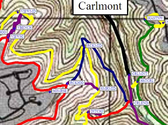 A short steep connector between the Carlmont trailhead (waypoint CRLEND, just up-canyon from the parking lot at waypoint CRLMNT), and the Middle Trail (at waypoint DITCHJ).
