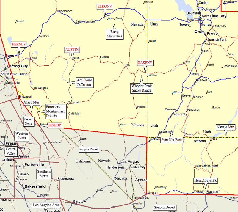 Great Basin Trailheads (click on any black label) and Towns (in red)