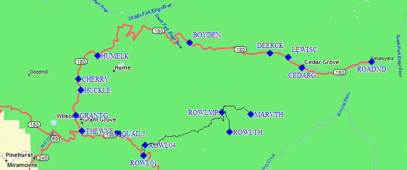 For waypoints along the northern approach, from Hwy 99 through Fresno, see The Wye page. As you travel east from Fresno on Hwy 180, you encounter a named intersection where Hwy 198 tees off Hwy 180 (waypoint THEWYE). The Wye is where you can turn north for Cedar Grove or south for Lodgepole.