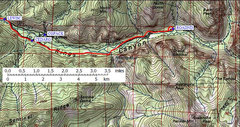 only about 1.5 miles to the ranger station at Grant Grove (waypoint GRANTG).