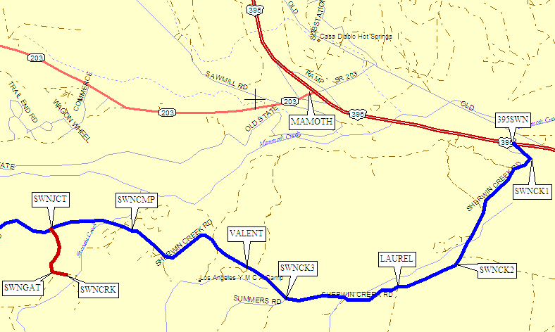Continuing in this direction, Sherwin Creek Road ends at Old Mammoth Road (waypoint MAMSWN), which comes takes you to Hwy 203 (waypoint MAINST) also called Main Street in Mammoth Lakes. Follow this road east 2.8 miles to Hwy 395 (waypoint MAMOTH).