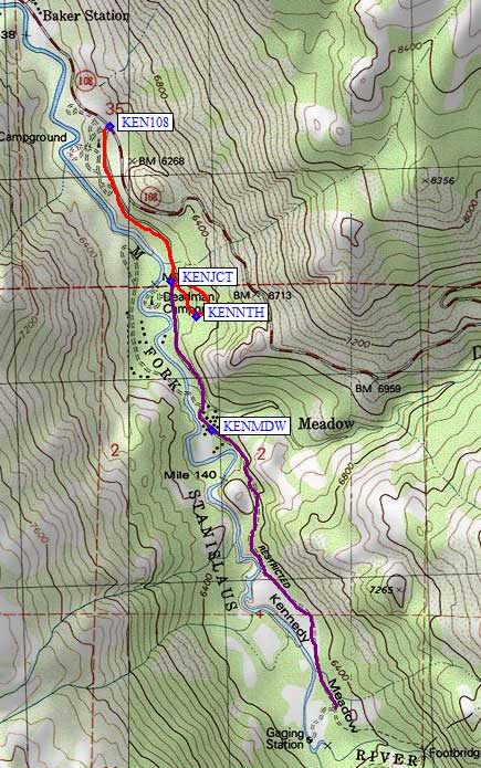 Turn south from Hwy 108 at the Kennedy Meadow and/or Baker Campground sign (waypoint KEN108). There is a pay phone right at this intersection. Stay left to avoid the private campground. Continue up the one-lane road to where there is a sign for trailhead parking (waypoint KENJCT, where the red and purple lines meet on the map to the right). Backpackers must park in this large parking lot. There are signs that say you must camp in designated sites and there is a two night limit, so there may be free trailhead camping. A trail leaves the parking lot near the toilet at waypoint KENNTH. A sign there says it's 1.5 miles to the wilderness.