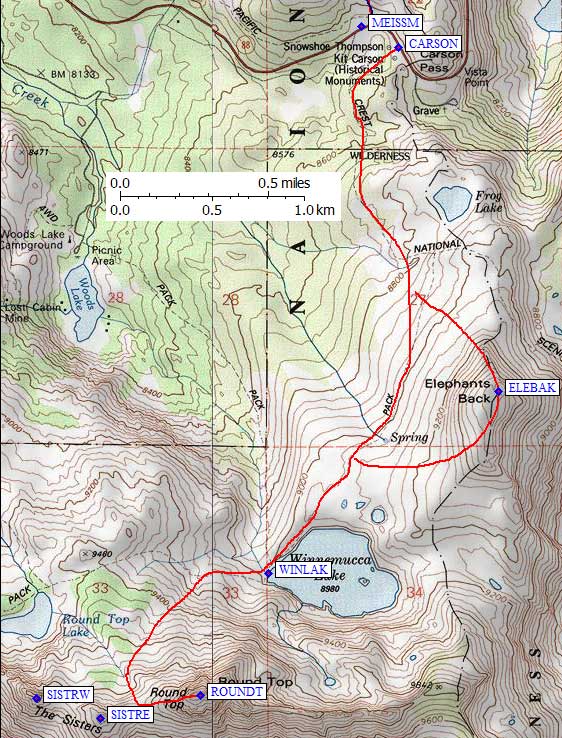 GPS route ROUND TOP CARSON goes to Sisters (waypoints SISTRE and SISTRW) by way of Elephants Back (waypoint ELEBAK) and Round Top (waypoint RNDTOP). It is intended for winter use, when trails are buried and cross-country travel is easy. Elephant is trivial, I haven't done Sisters, and Round Top is easiest from the saddle (RNDSAD) just west of the summit. Between the saddle and the summit you must sometimes ascend an icy or snowpacked steep slope, walk along a rocky ridge, drop to a notch, and climb the high point to the east. A direct ridge run is 3rd class, and can be dangerous with ice and/or snow on it. You can turn the notch on the south to keep the climb 2nd class, but in some snow conditions you'll feel exposed here. The Meiss Meadow Sno Park (waypoint MEISSM, map to the right) is about a tenth of a mile west from the Carson Pass lot, on the north side of the highway. It has less in and out traffic and seems to be more used by backcountry people. When the snow is deep, a burm between this lot and the highway cuts down some of the noise. Use this trailhead for Red Lake Peak and Stevens Peak. GPS route STEVENS PK CARSON goes to Stevens Peak (waypoint STEVSP) by way of Red Lake Peak (waypoint REDLKN). Both peaks have highpoints nearby that are NOT the location shown as the summit on the USGS maps (waypoints STEVNH and REDLKP). See Steve's trip report for winter climbing details. |