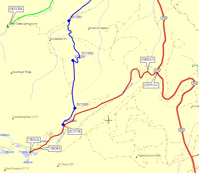 Even if you want to go between the Green Creek and Virginia Lake trailheads, the Dunderberg Meadow dirt connector is a bad choice because it's faster and not much longer to go around on the paved roads - but see GPS Route DUNDERBERG (the blue line on the map) if you're curious.