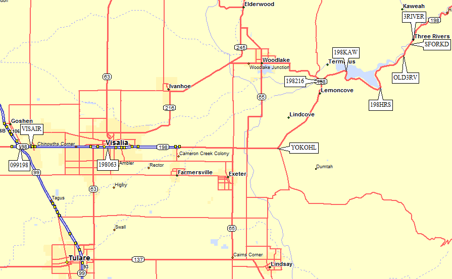 national park. Go through Visalia on freeway, crossing Hwy 63 at waypoint 198063.
