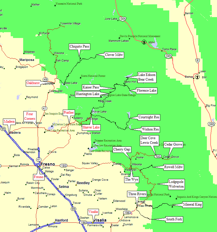 Hwy 145 or Hwy 168 to Prather and Shaver Lake, access to the main western reservoirs Hwy 180 (re-routed in 2010) to The Wye for northern Sequoia and Kings Canyon | |
