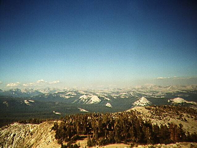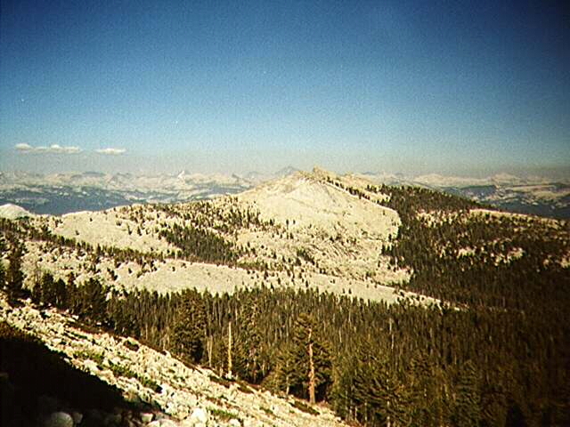 The trees finally gave way to Chinquapin around 9,600 and 200 feet later I was presented with Nelson's south face. Faced with 400 feet of dramatically steep talus, I found a nice rock and took a rest. The ground showed heavy activity by burrowing rodents but the only company I had were the songbirds in the few remaining Whitebarks. I was now above smog-line and I could see forever. Hengst and Eagle Peaks (of Mineral King) were easily distinguishable and the always visible Kaweah massif stood guard over the southeast horizon. And, nothing new here, Alta and Silliman were shrouded in a small local band of clouds.