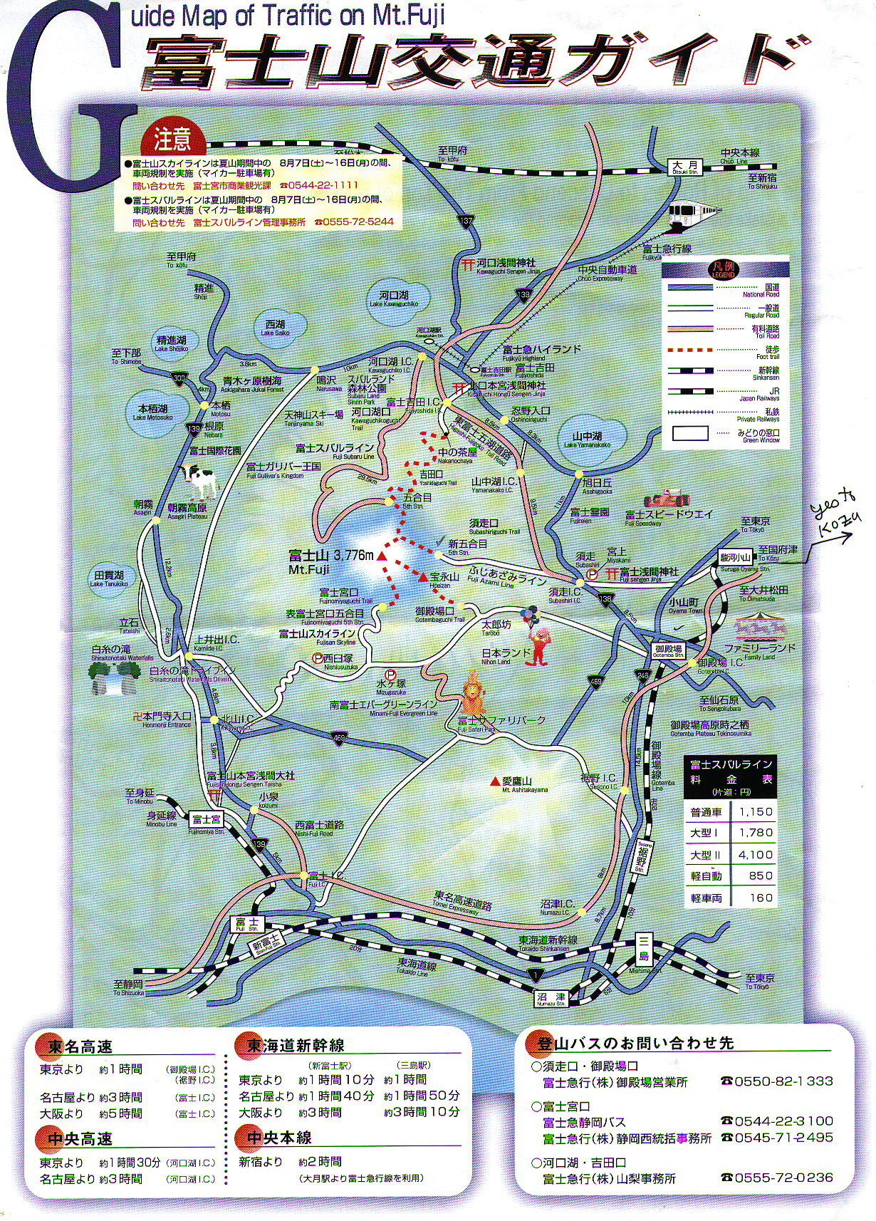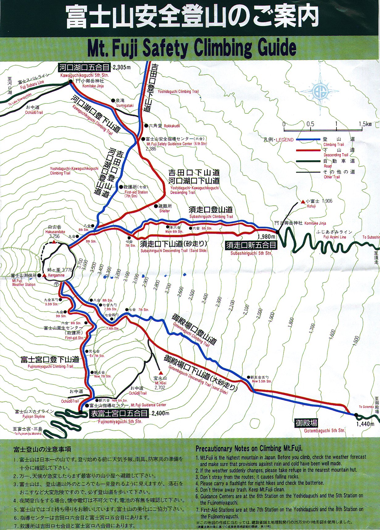 Be sure to get a decent map of the mountain. (I could give you an adequate photocopy.) Many maps that you can buy or scrounge have no contour lines, or are extremely vague. Most are only in Japanese, not labelled in English. The map I have is a folded sheet, double A4 size, about 8" x 12" with a handsome blue-ish color photo on the front, showing a lot of switchbacks. It is labelled "Climbing Mt. Fuji". I got a free copy at the foot of the Subashiri trail. I sure wish I had had it before I started! Inside are maps nicely double-labelled in English and in Kanji: