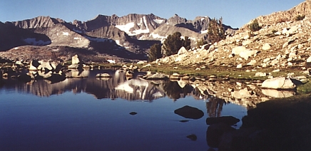 Picket's north ridge is either hard 2nd class or easy 3rd class, depending if you choose to hunt for easy places or just storm straight up it. The climbing is very consistent for 700', making this a great "first" third class peak if you're in the area but not used to technical climbs. The summit block itself is probably 3rd class (in spite of the east ridge's 2nd class rating), but is only 6' high so it's no big deal (sort of like the north ridge!). A far better peak than Kern Point, I spent a long time dozing and gazing before dropping back down to Mosquito Alley... then up to my pack, over Colby Pass, dinner at Colby Lake, and back into Mosquito Alley #2 for the night.