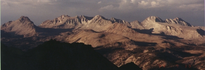 I traversed below the Kern Ridge toward Kern Point trying not to gain or lose elevation. The walking is fine slabs and tundra about half of the way, then you have to dip around a ridge and it's boulders and sand from there on. Kern Point is one of those peaks with a nice view and boring climbing, and with waiting out the storm I didn't summit until 7pm. Oops. Well, that's why we carry headlamps and a GPS, eh? Used 'em both, a lot. Round trip, the up/down elevation gain was about 500', making this a better choice than dropping 1000' down along the Kern-Kaweah River (if you're coming from Colby Pass).