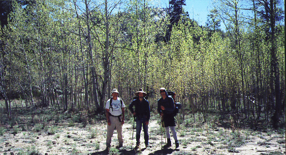If you see a "hikers only" sign (a hiker symbol and the word "solo") you've gone just a few yards too far. Continuing up that road will lead you to "the shack" at Los Llanitos, where old reports indicate you can park. The road is now closed, and you should NOT start in that direction. From waypoint TRCAMP, where we both parked and camped, you should head directly up the shallow drainage (at a bearing of 95 degrees from the cars) to waypoint ASPEN1 where a clear streambed forms and a trail shows up on the south bank. Follow the trail or tromp up the wash to waypoint ASPEN2, where you can turn left into the mouth of what looks like a poor choice of small washes (but actually is correct) or continue up the main drainage to waypoint ASPENA.