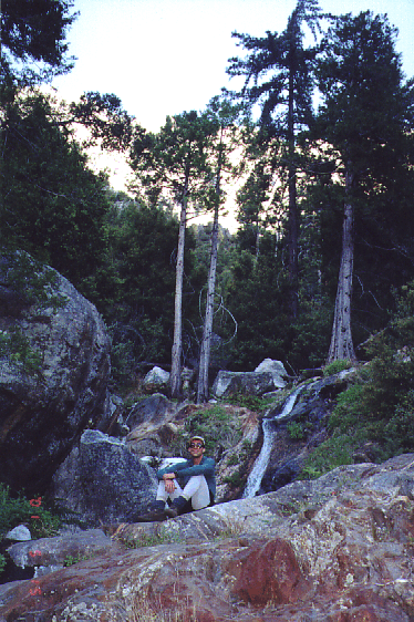 Around 7700' the canyon gets serious and you'll have to pick your route carefully to avoid 3rd class climbing at various dry waterfalls and cliff bands. The route stays on the left (west) side of the wash for the most part, but crosses occasionally. Here the ducks become positively annoying, because some of them are in places you can't get to and don't want to go. We found the red surveyor's tape more reliable than the cairns, but there are large gaps where no marks are to be found. Don't worry about it... just stay in the drainage until year-round water shows up again. I believe Gorin's Gulch joins the drainage we followed at a beautiful waterfall on the left (west) side of the canyon. From here to Camp Noche the going is particularly tough. Crawling under trees and through brush is bad enough even when your knees haven't been pounded with thousands of feet of cross country downhill with a full pack!