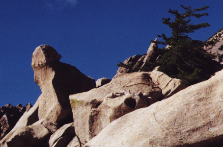 We drifted left (north) as we climbed, and waypoint DEVIL2 is on top of a minor ridge that comes into the drainage we were climbing. I do not recommend going that way, since the use trail we took on the way down stays in the center of the drainage at that elevation and was more brush-free. Routes abound, none is perfect. The plants slowly change as you climb, and odd rock formations make the climb interesting.