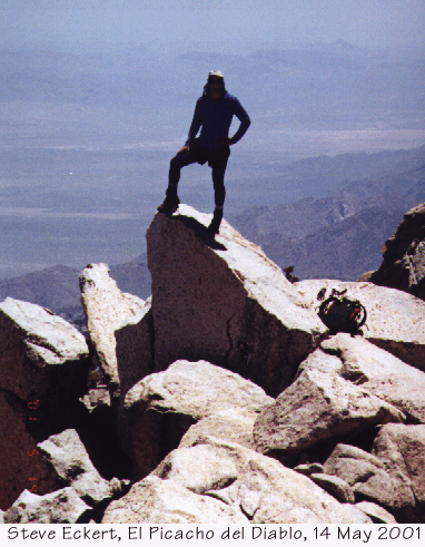 The high point of Baja, Mexico, is El Picacho del Diablo (for the non-Spanish-speaking crowd, that would be "Devil's Peak"). Linda Roman had been denied the summit twice before, once by roads and once by ice, so when she convinced John Strauch (another ice-bound veteran) to try again and asked me to go along I had some misgivings. Was it too soon and still snowy? Was it too late and baking hot? The last time I was in Mexico involved gunfire on two occasions, but I put all that aside and packed for all reasonable conditions except ice. Phil Rogul joined us at the last minute, and we left from San Diego on 12 May 2001 for our Roman Holiday (the trip that went to the devil... on purpose).