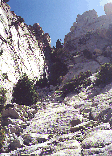 Drifting right, we stayed out of the center until we came to a bigger knob or face (near waypoint DEVIL4, apparently the entrance to Slot Wash) and traversed sharply to the left about 100' below the base of the face into the canyon leading to Wall Street. Here at 8200-8500' elevation we repeatedly found what looks like year-round water (based on the presence of thirsty plants like columbine) in Slot Wash, matching the information on Schad's map, and wished we had not carried all our water up from camp at 6300'. In this area the route appears to enter and exit the wash to avoid waterfalls and slick rock, so be prepared to climb out on the left (north) and return to the stream several times. Just above 8400' the cliffs force you back into the stream for a very short distance, then a waterfall forces you back out near 8500'. On the way down this was the only place we had to hunt for a route, so pay attention here!