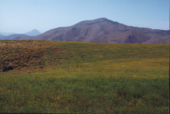 Turn east (uphill) into the canyon which starts at waypoint BLUEB1. This is where the trail from "the shack" intersects the trail you are on... but neither trail is really more than a ducked route. For completeness, I've included Cheslick's waypoints for the route from the shack at Los Llanitos (waypoints LLNTS1 and LLNTS2) to the "junction" at BLUEB1, but I have not field checked them and you should review my notes on datum problems below! (If you can't drive to the shack, there is no reason at all to walk there.) Stay on the left (north) side of the canyon as you approach the slabs that appear to block your route, then zigzag through them to the left and pop out at "Blue Bottle Saddle" (waypoint BLUEB2, northwest of Cerro Botella Azul) where you can see the peak(s) and the observatory for the first time.