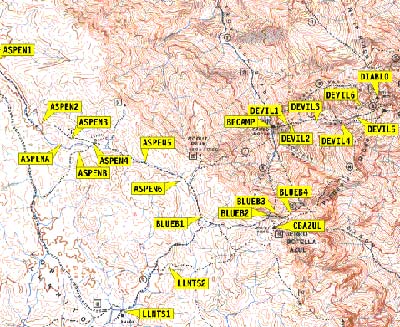 Since we were in such a deep canyon with very tall trees, the waypoint for Campo Noche (BPCAMP) may not be accurate. About 600' up Night Wash (at 6900') I stored waypoint DEVIL1 where camp was at a bearing of about 260 degrees. The waypoints are at an angle of 266, indicating that one or both of them may be off due to the narrow steep canyon and tree cover. While you are actually in Canyon del Diablo it is probably best to use terrain recognition and an altimeter instead of GPS coordinates.