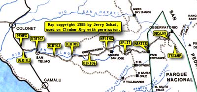 | This report refers often to waypoints plotted on a scanned image of Schad's map (used with permission from Jerry Schad). The hardcopy map Parque Nacional San Pedro Martir (San Pedro Martir National Park) including Picacho del Diablo by Jerry Schad, published by Centra Publications, is a must-have. It contains topographic data, route summaries, and background information on the park. |