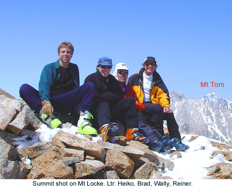 On Sat, 4/10, 6am, we met at the intersection of the Buttermilk Rd and Hwy 168 about 7.5 mi W of Bishop. "We" means Wally Drake, Angel Ocana, Brian McElwain, Leslie Hofherr, Heiko Knapp, Brad McHose and co-leaders Randy Lamm and Reiner Stenzel. We drove up the unpaved road to close to the McGee Creek, consolidated into two high-clearance 4WD cars which made it across the stream and close to the end of the dirt road. From there we hiked a short distance through brush to the snowline at about 9400'. Some skinned up, most continued to hike. As we climbed into the Wahoo Gully we used boot crampons on the hard snow. Ahead of us were two skiers with a dog. It took about 2 hours to climb the Wahoo Gully. At the top we crossed a band of rocks, then ascended the SE facing snowfield to the summit.