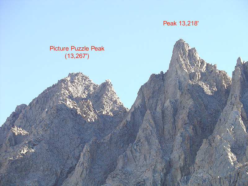This is a short trip report for two peaks, which have not been described in the trip archives of climber.org. Both peaks are in The Inconsolable Range north of the Palisade Range, east of the Bishop Pass trail. Gendarme Pk (13,267') is climbed infrequently and the unnamed Peak 13,218' just south of Picture Puzzle Pk (13,276') may have been unclimbed altogether since the peak is not even marked on the map and there was no human record on its summit.