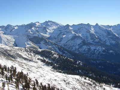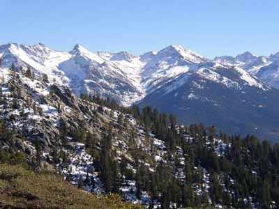 Passing Mehrten Meadows (9200') I put my snowshoes back on, since the trail was back under the trees. The only tracks I saw here were boots - no skis or snowshoes. I made camp around 9400' just up the Alta Peak trail around 3pm, on only a few inches of hard consolidated snow. The night was not particularly cold, perhaps into the high 20's.