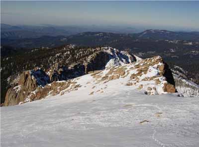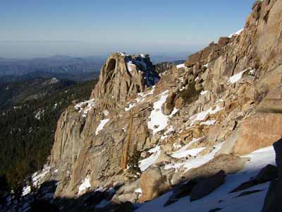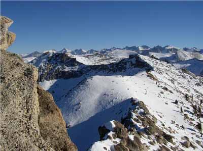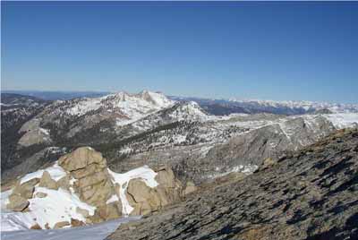 Started out for the peak at 8am, snowshoeing up the Tharp's Rock gully to about 10600', where I ditched them near a rock and proceeded up to the summit plateau with crampons and ice axe. Postholed up to my waist in a few spots, but it was a short walk. I'd read some beta somewhere about icy conditions on the summit block (11204'), but found mainly just hard snow, and frontpointed a little just for fun (I really need to get back to Lee Vining...)